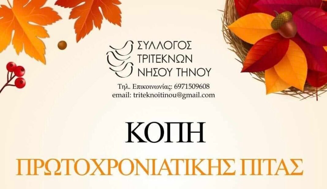 Ο Σύλλογος Τριτέκνων Τήνου θα πραγματοποιήσει κοπή πρωτοχρονιάτικης πίτας στις 4 Φεβρουαρίου στις 11:30 π.μ. στην καφετέρια La Strada.