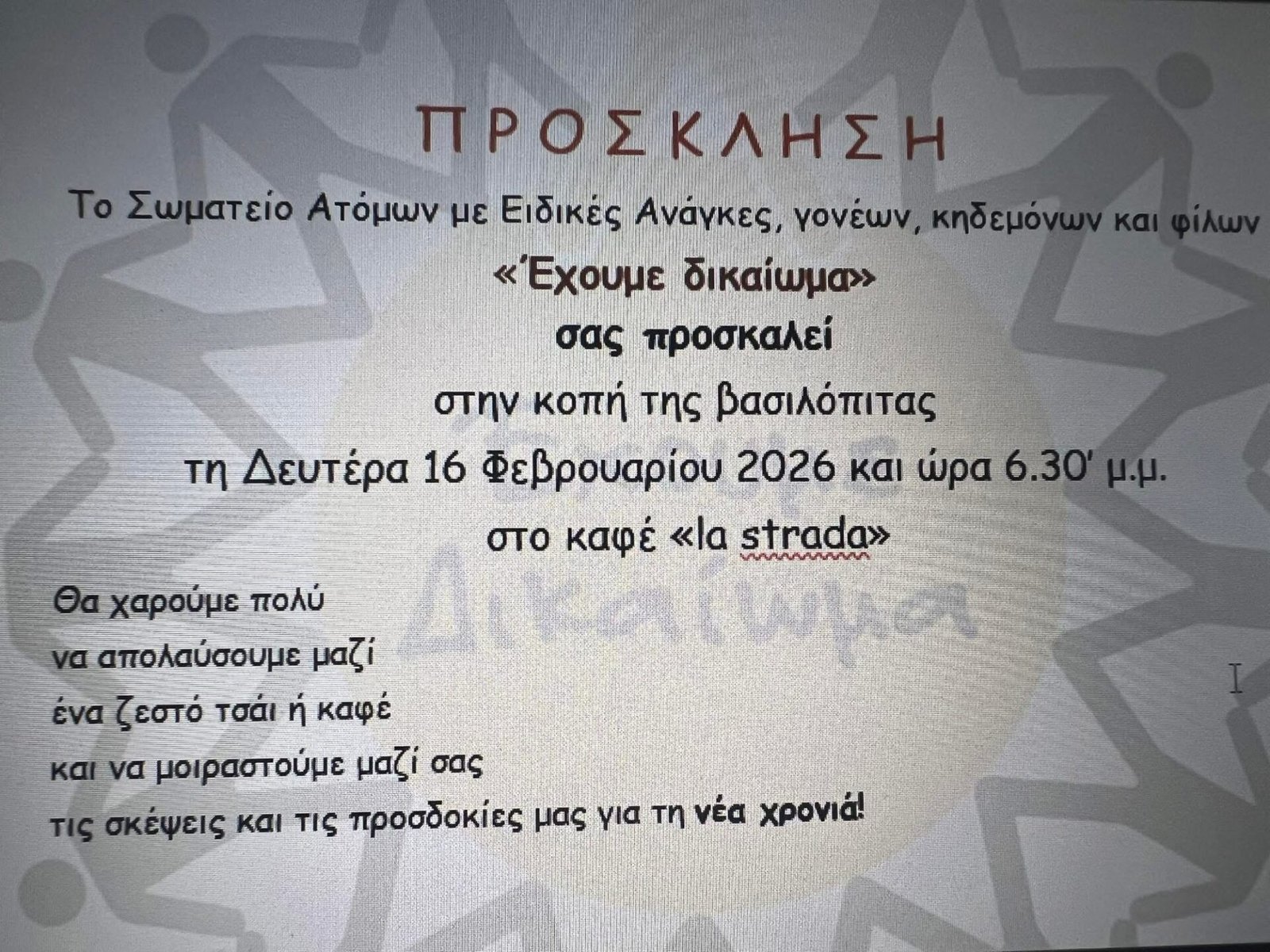 Το Σωματείο Ατόμων με Ειδικές Ανάγκες, γονέων, κηδεμόνων και φίλων «Έχουμε δικαίωμα» σας προσκαλεί στην κοπή της βασιλόπιτάς του τη Δευτέρα 16 Φεβρουαρίου 2026, στις 18:30, στο καφέ La Strada.