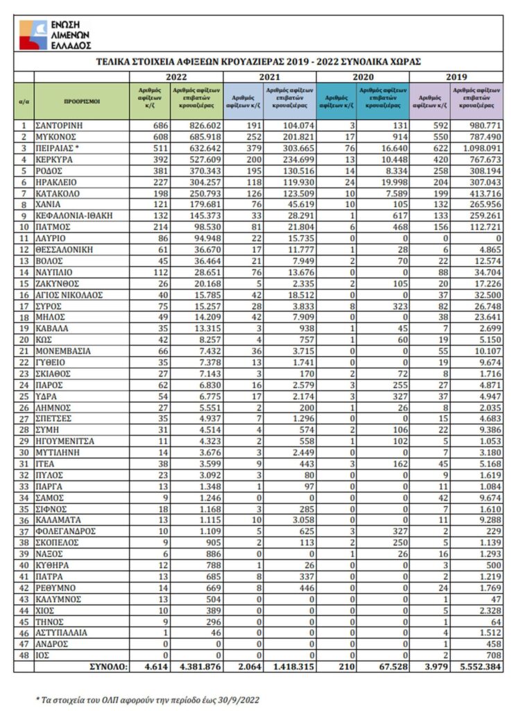 Ειδικότερα το έτος 2022 οι συνολικές αφίξεις κρουαζιερόπλοιων στα Ελληνικά λιμάνια ανήλθαν στις 4.614 και ο αριθμός επιβατών σε 4.381.876. Η αύξηση στις αφίξεις σε σχέση με το 2021 ήταν κατακόρυφη και ανέρχεται σε ποσοστό 123,5%, ενώ στους επιβάτες ακόμη μεγαλύτερη στο 209%. Ιδιαίτερα κρίσιμο στοιχείο συνιστά το γεγονός ότι με έτος αναφοράς το 2019, ο αριθμός αφίξεων κρουαζιεροπλοίων αυξήθηκε κατά 16% ενώ με την ενσωμάτωση των τελικών στοιχείων για τον Οργανισμό Λιμένος Πειραιά, όπου τα σημερινά στοιχεία αφορούν το εννιάμηνο έως 30 Σεπτεμβρίου, η αύξηση σε σχέση με το 2019 αναμένεται να αγγίξει το 20%. Στον αριθμό κρουαζιερόπλοιων στις πρώτες θέσεις βρίσκονται η Σαντορίνη, η Μύκονος, ο Πειραιάς, η Κέρκυρα, η Ρόδος, το Ηράκλειο, η Πάτμος και το Κατάκολο. Στον αριθμό επιβατών προηγούνται η Σαντορίνη, η Μύκονος, ο Πειραιάς, η Κέρκυρα, η Ρόδος, το Ηράκλειο και το Κατάκολο, ενώ ψηλά βρίσκονται επίσης τα Χανιά, η Κεφαλονιά-Ιθάκη, η Πάτμος, το Λαύριο, η Θεσσαλονίκη, ο Βόλος και το Ναύπλιο. Είναι αξιοσημείωτο ότι σε σχέση με το 2021, παρατηρείται αύξηση στις αφίξεις σε όλους τους προορισμούς και ιδιαίτερα στο Λαύριο κατά 291%, στη Θεσσαλονίκη και στη Σαντορίνη κατά 259%, στη Μύκονο κατά 141%, στο Βόλο κατά 114%, στην Κέρκυρα 96%, στη Ρόδο 95% και στο Ηράκλειο κατά 92%. Σημαντικά ενισχυμένο εμφανίζεται και το homeporting στα ελληνικά λιμάνια του Πειραιά, της Θεσσαλονίκης, του Λαυρίου, της Κέρκυρας και του Ηρακλείου, όπου προσφέρεται η σχετική δυνατότητα στους επιβάτες.