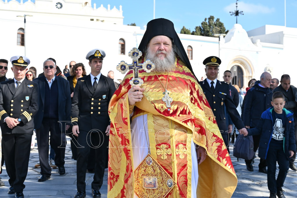 Κατά το έθος, μετά το πέρας της Θείας Λειτουργίας, πραγματοποιήθηκε η λιτάνευσις των ιερών Εικόνων, από τον Πανίερο Ναό της Ευαγγελιστρίας και όλες τις Ενορίες ανά τας οδούς της πόλης, με πλήρη εκκλησιαστική τάξη προπορευομένων των μαθητών και μαθητριών όλων των βαθμίδων εκπαιδεύσεως και της Φιλαρμονικής του Π.Ι.Ι.Ε.Τ., των ιεροπαίδων και των ιεροψαλτών, με την συμμετοχή των Εφημερίων και Διακόνων της Ιεράς Νήσου Τήνου, της Αντιπεριφερειάρχη Υγείας και Κοινωνικής Μέριμνας και Επάρχου Τήνου, του Δημάρχου Τήνου, του Υποδιοικητή της σχολής Λιμενοφυλάκων του Λιμενικού Σώματος, συνοδευομένου μετά τιμητικού αγήματος των Δοκίμων Λιμενοφυλάκων δευτεροετούς εκπαιδεύσεως, του Λιμενάρχη Τήνου, της Αναπληρώτριας Διοικητού του Αστυνομικού Τμήματος, του Διοικητή της Πυροσβεστικής Υπηρεσίας, των Αντιδημάρχων, του Προέδρου του Δημοτικού Συμβουλίου, του Προέδρου του Λιμενικού Ταμείου, των Δημοτικών Συμβούλων, των μελών της Διοικούσης Επιτροπής του ΠΙΙΕΤ, των Διευθυντών και Εκπαιδευτικών των Σχολείων όλων των βαθμίδων, των Προέδρων και μελών Συλλόγων και Φορέων και με την συμμετοχή ευλαβών χριστιανών προσκυνητών και Τηνίων.