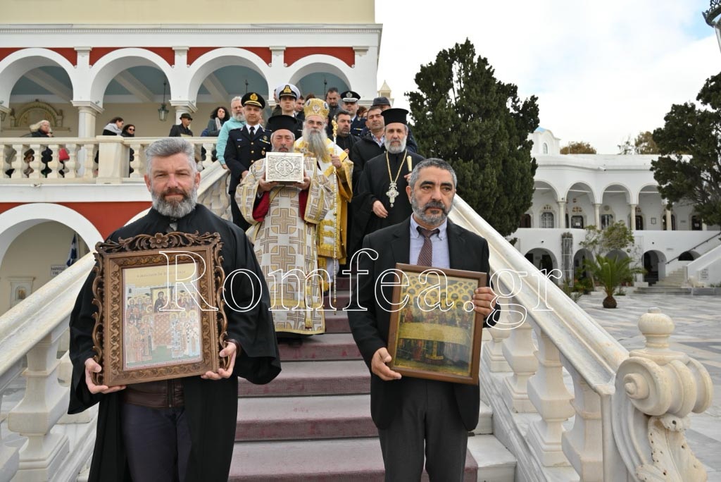 Τέλος ευχαρίστησε τον Σεβασμιώτατο κ. Δωρόθεο για την ευλογία και κανονική αδεία του να ιερουργήσει στον Πανίερο Ναό της Μεγαλόχαρης, τον Αρχιερατικό Επίτροπο της Ιεράς Νήσου Τήνου και τα μέλη της Διοικούσης Επιτροπής του Ιερού Ιδρύματος για την υποδοχή και τη φιλοξενία.