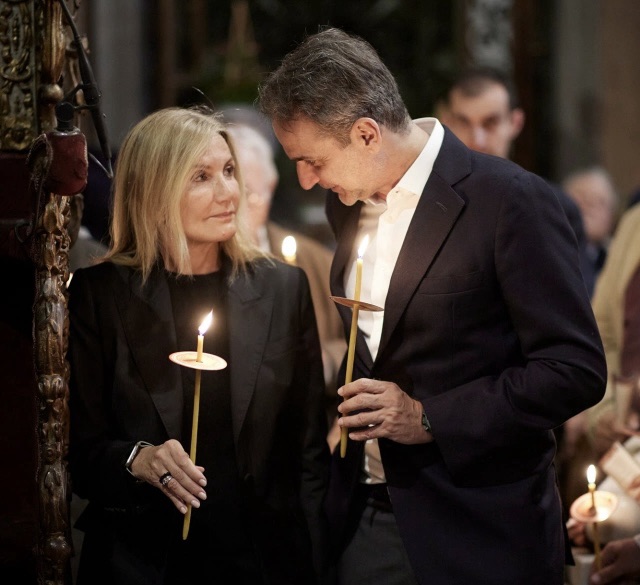 Ο Κυριάκος Μητσοτάκης, συνοδευόμενος από τη σύζυγό του Μαρέβα Γκραμπόφσκι, παρακολούθησε τη Μεγάλη Παρασκευή, την Ακολουθία και την Περιφορά του Επιταφίου στον Ιερό Ναό Ευαγγελιστρίας της Τήνου.