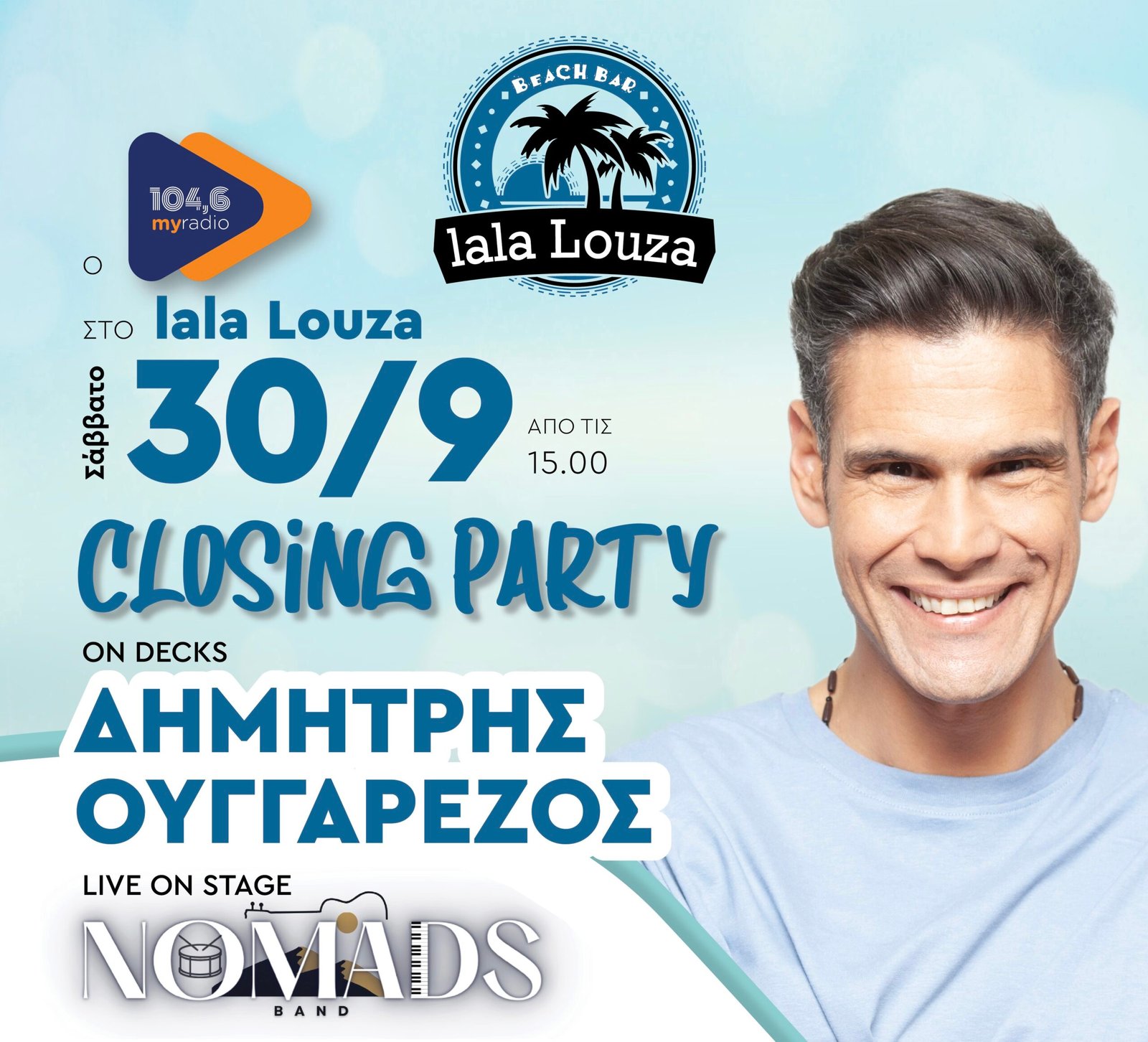 Το myradio 104,6 ταξιδεύει στο lala louza beach bar, το Σάββατο 30 Σεπτεμβρίου 2023 για το Closing Party με τον Δημήτρη Ουγγαρέζο on Decks από τις 15.00 και μετά, με Live on Stage οι NOMADS Band