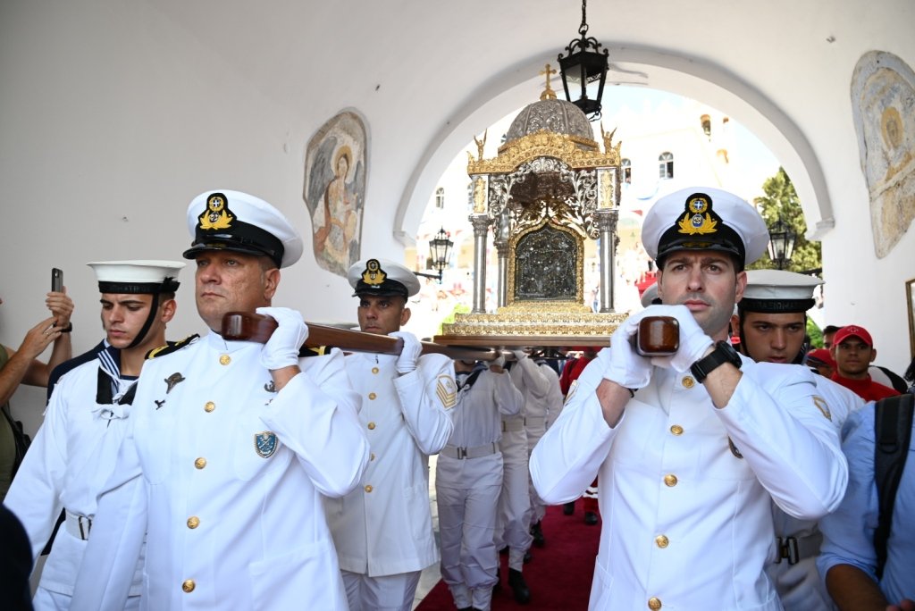 Ακολούθησε πάνδημος Λιτανεία της Θαυματουργού Εικόνος της Μεγαλόχαρης, υπό τους χαρμόσυνους συριγμούς των ελλιμενισμένων προς απόδοση τιμών πλοίων του Πολεμικού Ναυτικού Φ/Γ «ΑΙΓΑΙΟΝ», Α/Γ «ΧΙΟΣ», ΤΠΚ «ΜΥΚΟΝΙΟΣ» και Ρ/Κ «ΑΧΙΛΛΕΥΣ» και του Λιμενικού Σώματος ΠΑΘ 090 “ΓΑΥΔΟΣ”, ΠΛΣ 609 και ΠΛΣ 219, την οποία πλαισίωσαν αγήματα εξ αυτών, μαζί με τη Φιλαρμονική του Πολεμικού Ναυτικού και του ΠΙΙΕΤ.