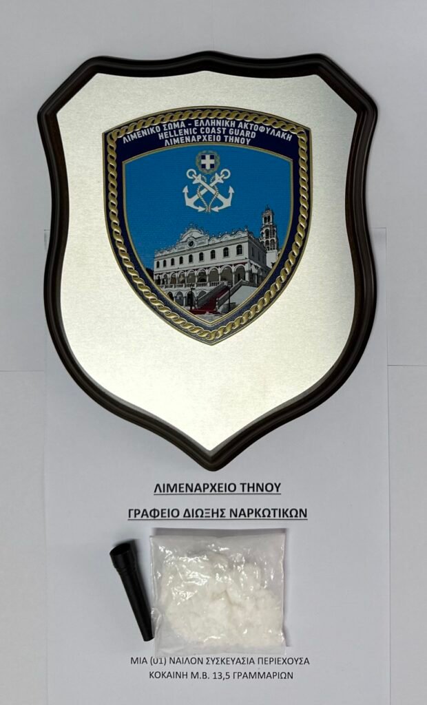 Στη σύλληψη ενός (01) ημεδαπού ηλικίας 27 ετών, προέβησαν μεσημβρινές ώρες την 04/08/2023, Στελέχη γραφείου Δίωξης Ναρκωτικών του Λιμεναρχείου Τήνου, για παράβαση του νόμου Ν.4139/13 «περί εξαρτησιογόνων ουσιών», διότι μετά από διενέργεια ελέγχου εντοπίστηκε και κατασχέθηκε μία (01) νάιλον συσκευασία περιέχουσα κοκαΐνη, συνολικού μικτού βάρους δεκατριών (13) γραμμαρίων και πέντε (05) δεκάτων του γραμμαρίου (13,5 γρ.)