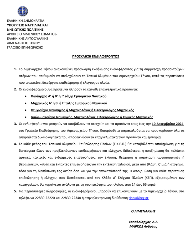 - Το Λιμεναρχείο Τήνου ανακοινώνει πρόσκληση εκδήλωσης ενδιαφέροντος για τη συμμετοχή προσοντούχων ατόμων που επιθυμούν να στελεχώσουν το Τοπικό Κλιμάκιο του Λιμεναρχείου Τήνου, κατά τις περιπτώσεις που απαιτείται διενέργεια επιθεώρησης ή έλεγχος σε πλοία.