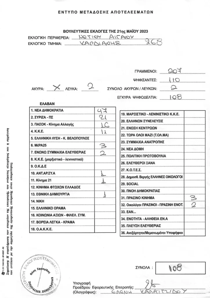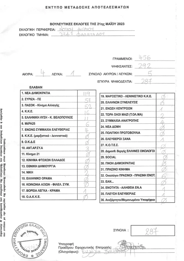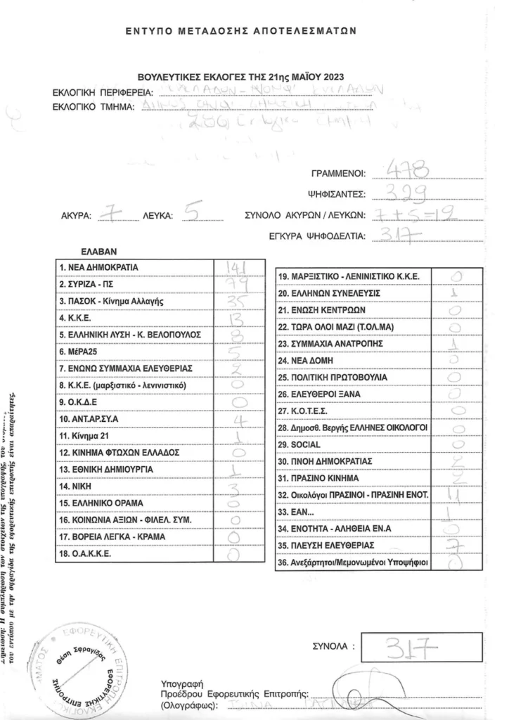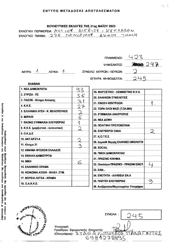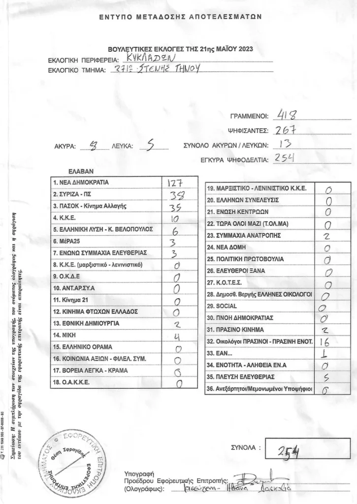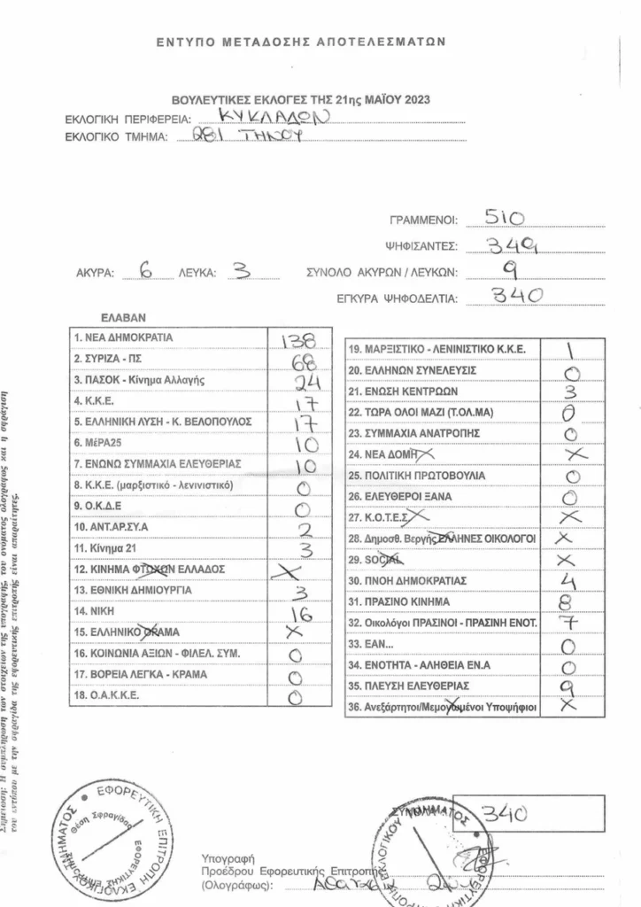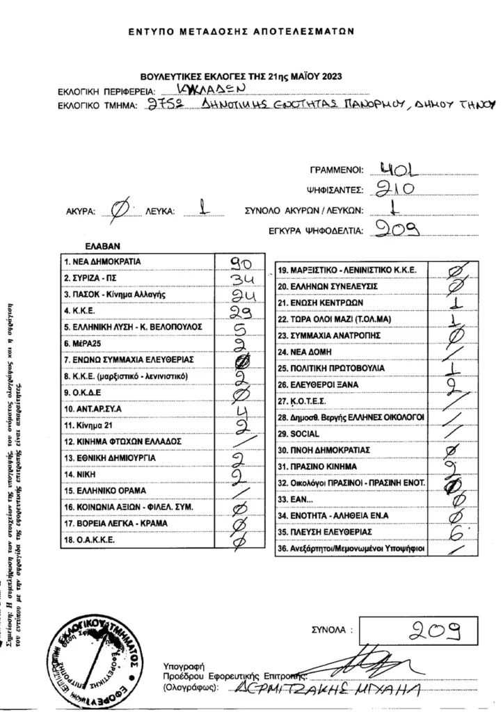 Τελικά αποτελέσματα βουλευτικών εκλογών 2023 στην Τήνο ανα τμήμα
