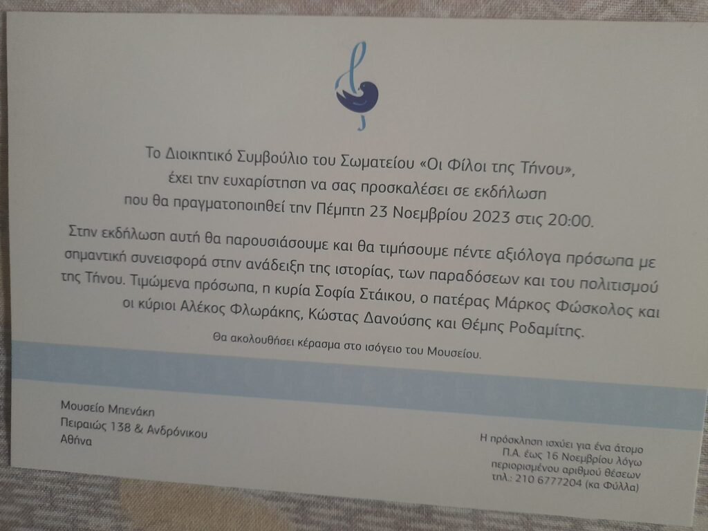 Τιμητική εκδήλωση, στο Μπενάκειο Μουσείο, για επιφανείς πολίτες Τήνιους και φίλους του νησιού μας, για τη σημαντική συνεισφορά τους, στην ανάδειξη της ιστορίας, των παραδόσεων και του πολιτισμού της Τήνου.