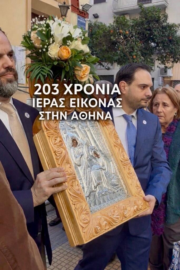 Πραγματοποιήθηκε το εορταστικό πρόγραμμα για τη συμπλήρωση 203 ετών από την παρουσία της Ιερής Εικόνας στην Αθήνα. Οι εκδηλώσεις ξεκίνησαν το πρωί με τη Θεία Λειτουργία στον Ιερό Ναό Αγίου Βασιλείου οδού Μετσόβου, στην οποία χοροστάτησε ο Θεοφιλέστατος Επίσκοπος Ρωγών κ. Φιλόθεος.