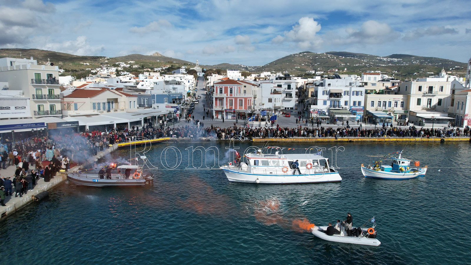 Μετά την Ακολουθία του Μεγάλου Αγιασμού στη μαρμάρινη φιάλη στο προαύλιο του Πανιέρου Ναού της Ευαγγελιστρίας, πραγματοποιήθηκε λιτάνευση του Τιμίου Σταυρού στον λιμένα της Τήνου, προπορευομένης της Φιλαρμονικής του ΠΙΙΕΤ, όπου σε ειδικά προευπρεπισμένη εξέδρα πραγματοποιήθηκε η τελετή του Αγιασμού των υδάτων.