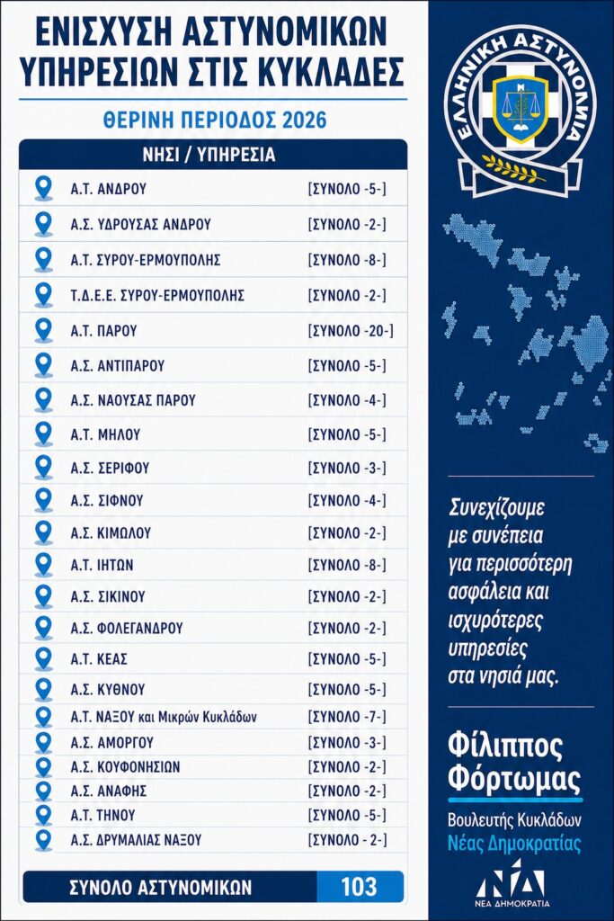 Στο πλαίσιο αυτό, ενισχύονται οι αστυνομικές υπηρεσίες, σε όλα τα νησιά των Κυκλάδων, με συνολικά 103 αστυνομικούς, ενόψει της θερινής περιόδου.