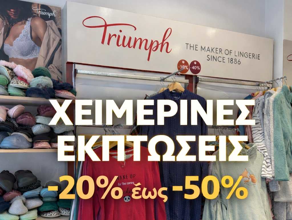 Όλα τα χειμωνιάτικα είδη διατίθενται με εκπτώσεις από 20% έως 50%, σε επιλεγμένα σχέδια γυναικείων εσωρούχων και ειδών άνεσης, με την ποιότητα και την εφαρμογή που χαρακτηρίζουν την Triumph.