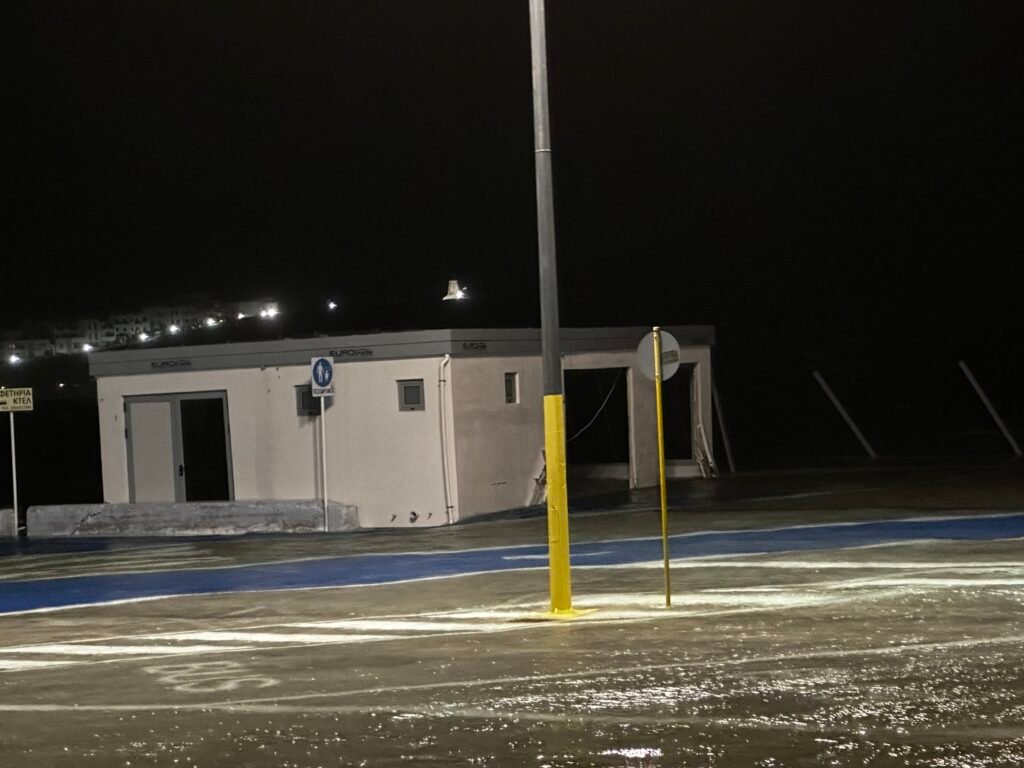 Μετακινήθηκε το «κιόσκι» του υδατοδρομίου στο λιμάνι της Τήνου απόψε 25 Νοεμβρίου του 2023 εξαιτίας των ισχυρών Νοτιάδων(10 Μποφόρ) που επικρατούν ακόμα στο νησί της Τήνου.