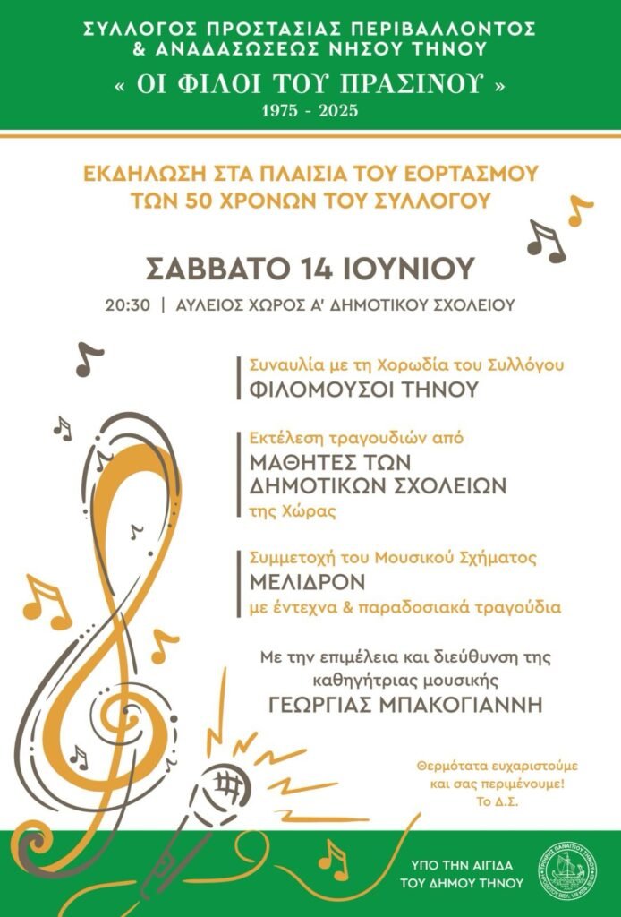 Στα πλαίσια του εορτασμού των 50χρόνων από την ίδρυση του Συλλόγου «ΟΙ ΦΙΛΟΙ ΤΟΥ ΠΡΑΣΙΝΟΥ», και υπό την αιγίδα του Δήμου Τήνου, διοργανώνεται μουσική εκδήλωση, το ΣΑΒΒΑΤΟ 14 Ιουνίου, ώρα 20:30, στο προαύλιο του 1ου Δημοτικού σχολείου.