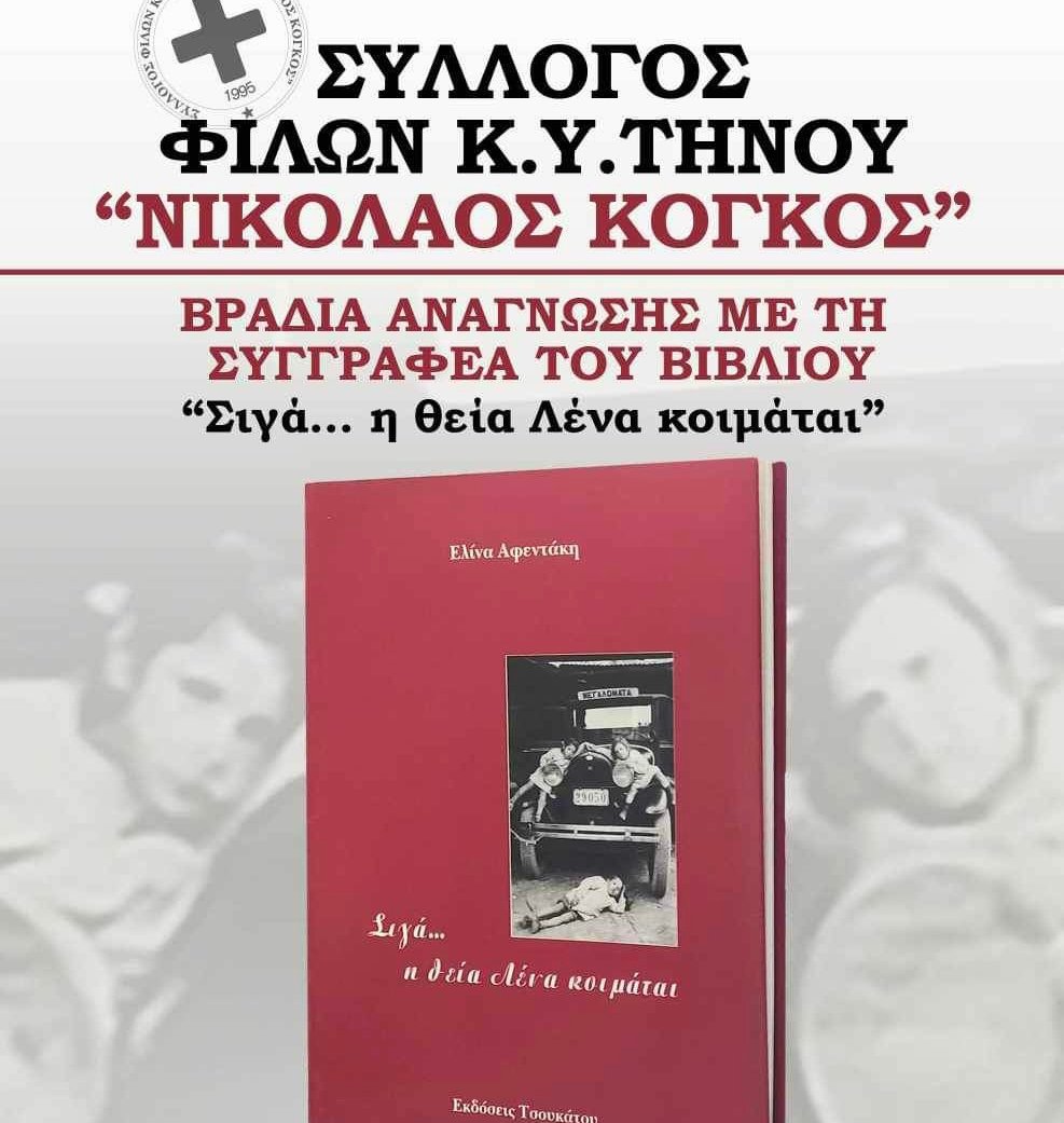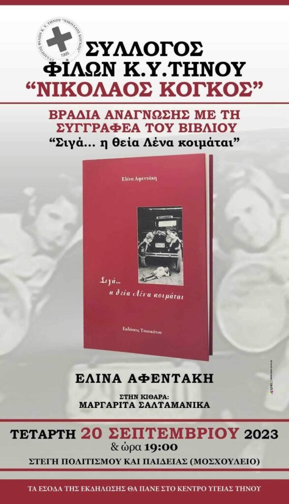 Την Τετάρτη 20 Σεπτεμβρίου του 2023 στις 19:00 στη στέγη πολιτισμού και παιδείας(Μοσχούλειο), θα πραγματοποιηθεί μια Βραδιά Ανάγνωσης με τη συγγραφέα του βιβλίου “Σιγά… η θεία Λένα κοιμάται” Ελίνα Αφεντάκη, όπου τα έσοδα της εκδήλωσης θα πάνε στο Κέντρο Υγείας Τήνου.