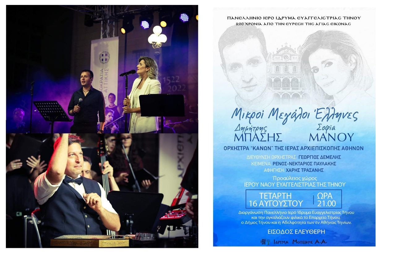 Το Πανελλήνιο Ιερό Ίδρυμα Ευαγγελιστρίας Τήνου με αφορμή τα 200 χρόνια από την εύρεση της Αγίας εικόνας, παρουσιάζει την μουσική εκδήλωση με τον τίτλο: «Μικροί Μεγάλοι Έλληνες», την Τετάρτη 16 Αυγούστου στον προαύλειο χώρο του Ιερού Ναού Ευαγγελιστρίας Τήνου στις 21.00 μ.μ.