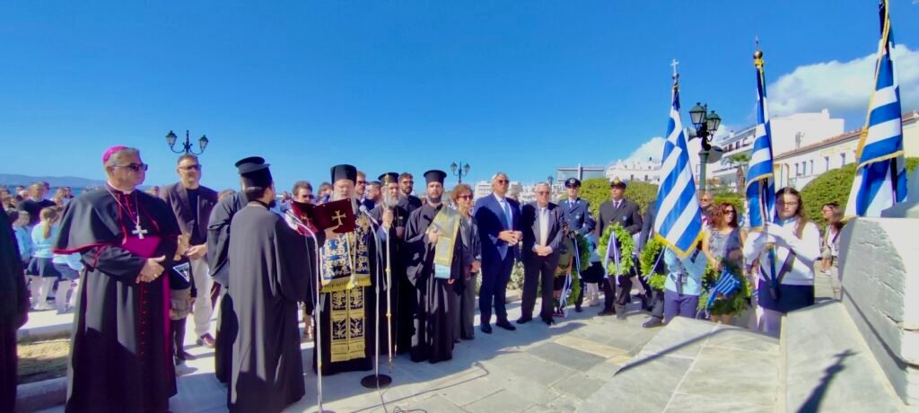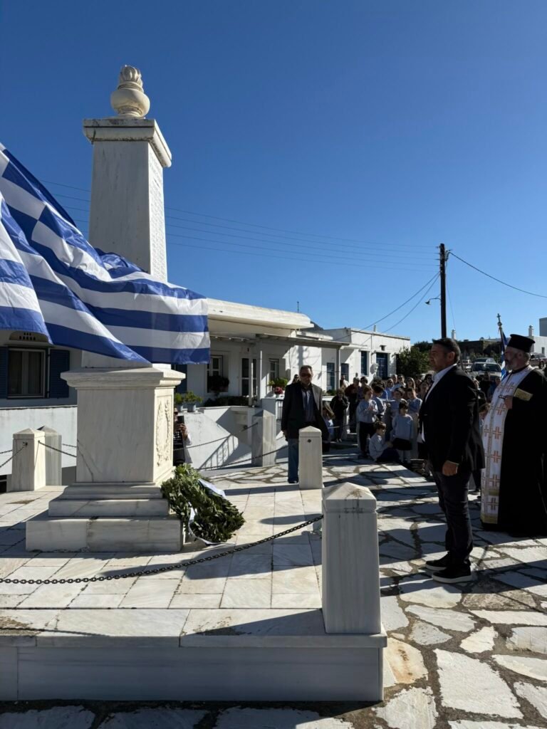 Για την Τήνο, η σημερινή επέτειος είναι βαθιά χαραγμένη στη συλλογική μας μνήμη. Ο τόπος μας βίωσε, νωρίτερα από κάθε άλλο, την πρόκληση της εποχής, με τον ύπουλο τορπιλισμό του ευδρόμου «Έλλη» στο λιμάνι μας, ανήμερα της μεγάλης εορτής της Παναγίας, τον Αύγουστο του 1940. Ωστόσο, το αλύγιστο φρόνημα των Τηνίων και ολόκληρου του Έθνους έδωσε το στίγμα της απάντησης που θα ακολουθούσε: την περήφανη άρνηση της 28ης Οκτωβρίου.