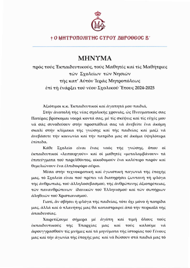 Μήνυμα του Ποιμενάρχου Μητροπολίτου Σύρου-Τήνου κ. Δωροθέου Β’ προς τους εκπαιδευτικούς και μαθητές