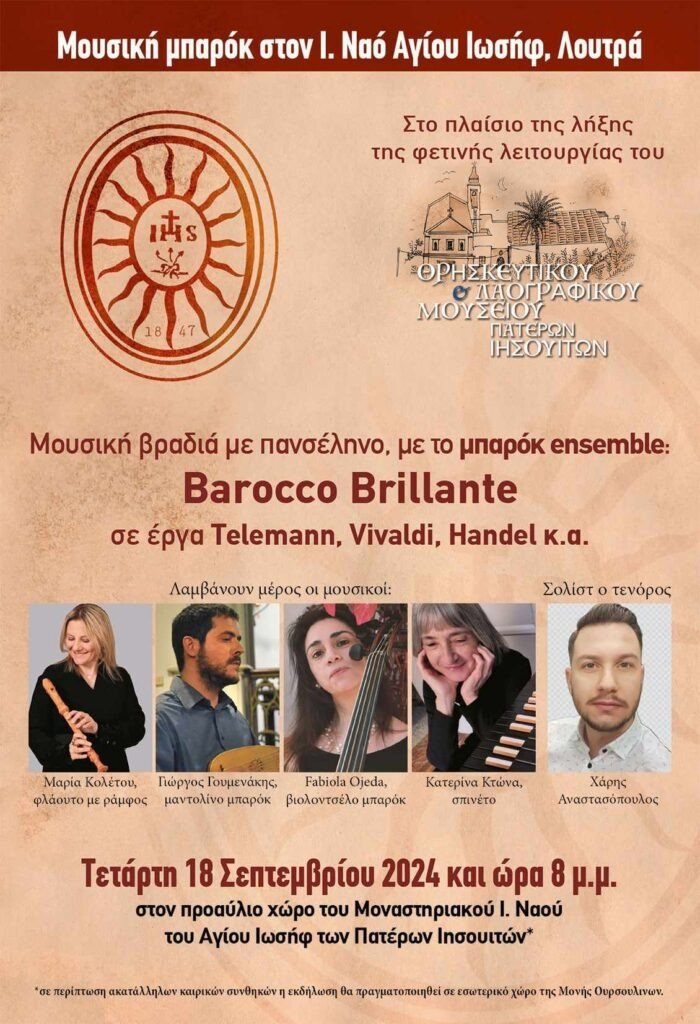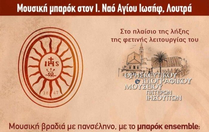Την Τετάρτη, 18 Σεπτεμβρίου 2024 και ώρα 8 μ.μ., θα πραγματοποιηθεί μια μοναδική μουσική βραδιά στον προαύλιο χώρο του Μοναστηριακού Ιερού Ναού του Αγίου Ιωσήφ των Πατέρων Ιησουιτών, στα Λουτρά. Το γεγονός εντάσσεται στο πλαίσιο της λήξης της φετινής λειτουργίας του Θρησκευτικού και Λαογραφικού Μουσείου Πατέρων Ιησουιτών.