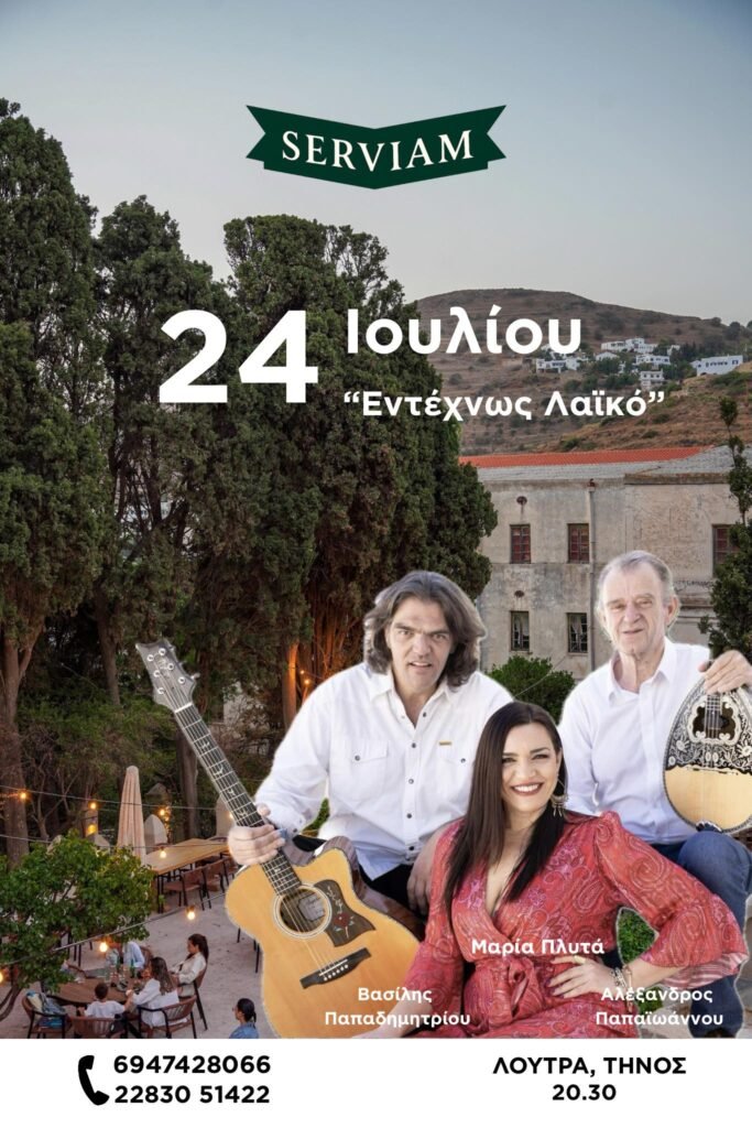 Το σχήμα «Εντέχνως Λαϊκό» σας προσκαλεί στις 24 Ιουλίου στο Serviam (Λουτρά Τήνου) για μια μουσική βραδιά-ωδή στο καλό ελληνικό τραγούδι!