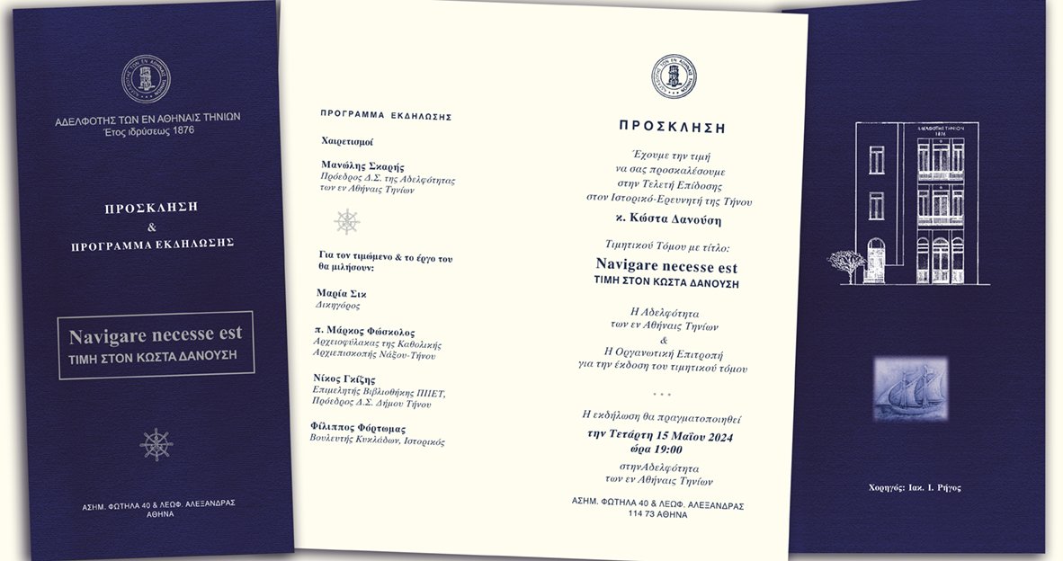 Θα αποτελέσει ιδιαίτερη τιμή για μας η παρουσία σας στην απονομή του τιμητικού τόμου «Navigare necesse est. Τιμή στον Κώστα Δανούση», η οποία θα πραγματοποιηθεί την Τετάρτη, 15 Μαΐου 2024, και ώρα 19.00΄ στο κτίριο της Αδελφότητας των εν Αθήναις Τηνίων (Λ. Αλεξάνδρας & Ασημ. Φωτήλα).