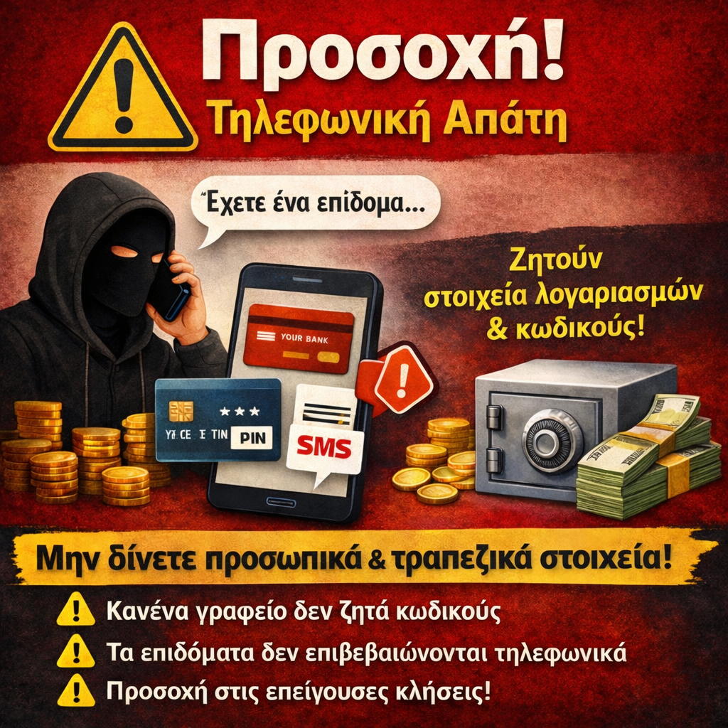 Κανένα λογιστικό γραφείο ή κρατική υπηρεσία δεν ζητά τηλεφωνικά κωδικούς τραπεζών. Τα επιδόματα και τα vouchers δεν απαιτούν επιβεβαίωση λογαριασμού μέσω τηλεφώνου. Οι δράστες συχνά μιλούν πειστικά και επικαλούνται «επείγουσα προθεσμία» για να πιέσουν το θύμα.