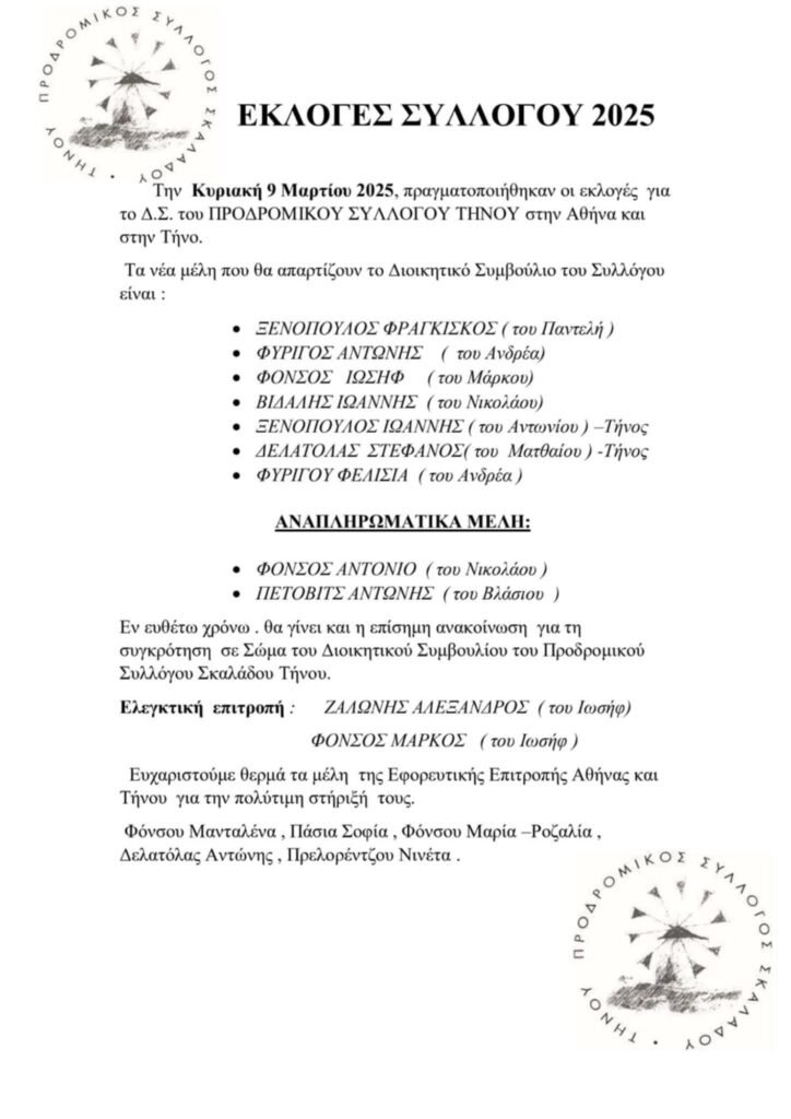 Την Κυριακή 9 Μαρτίου 2025 πραγματοποιήθηκαν οι εκλογές για την ανάδειξη του νέου Διοικητικού Συμβουλίου του Προδρομικού Συλλόγου Τήνου, τόσο στην Αθήνα όσο και στην Τήνο.