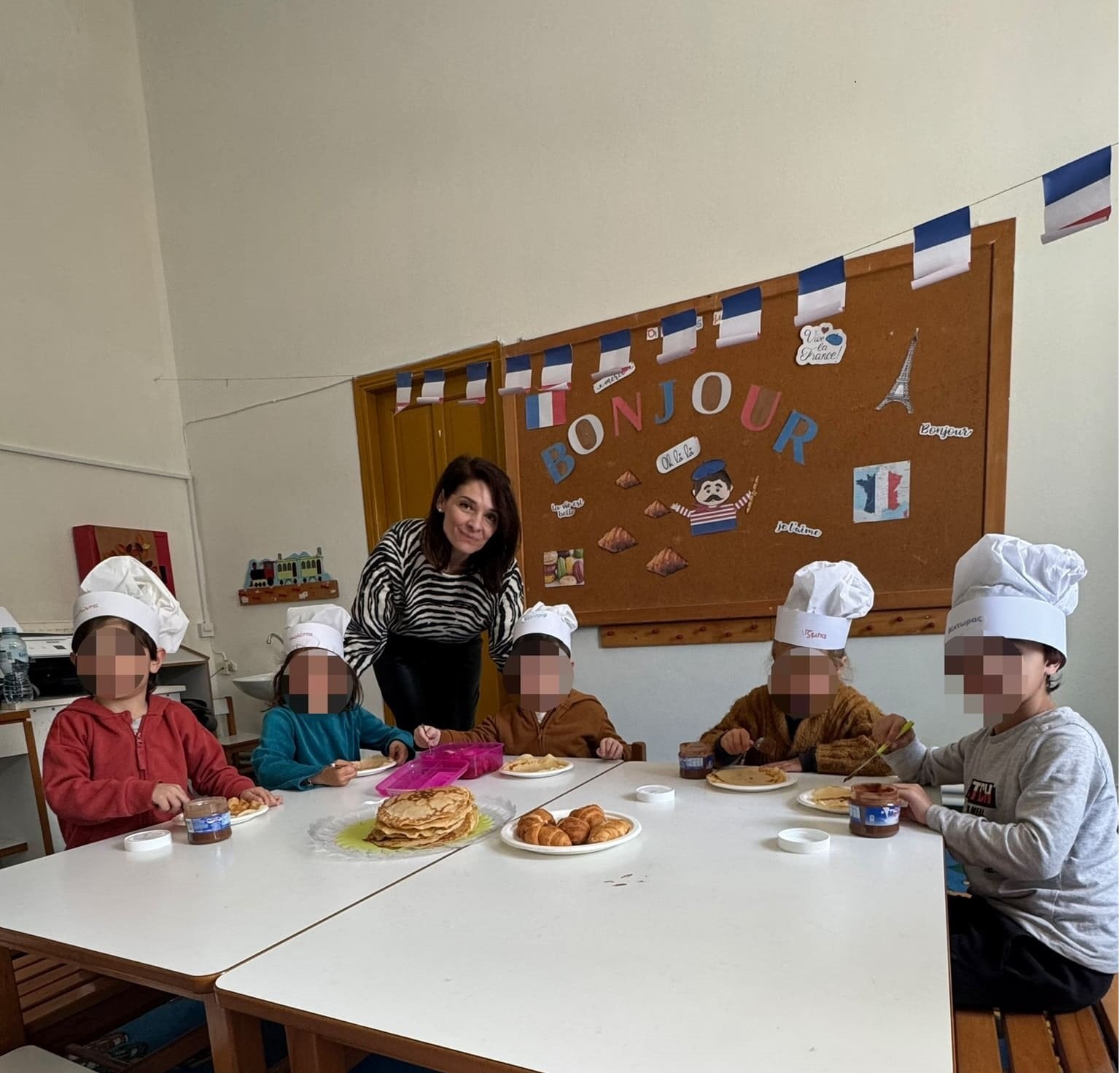 Με αφορμή τη Διεθνή Ημέρα Γαλλοφωνίας (20 Μαρτίου), μετά από πρόσκλησή μας, επισκέφτηκε το Νηπιαγωγείο μας η καθηγήτρια ΠΕ05 Γαλλικής Γλώσσας η οποία υπηρετεί στα Δημοτικά Σχολεία του νησιού μας, κ. Μαγνήσαλη Βασιλική. Μέσα από δραστηριότητες βιωματικές και παιγνιώδεις, τα παιδιά ήρθαν σε επαφή με τη γαλλική γλώσσα αλλά και τη γαλλική κουλτούρα! Φτιάξαμε διαβατήρια, βαλίτσες και έτοιμοι για απογείωση! Μεταμορφωθήκαμε σε ζωγράφους της Μονμάρτρης αλλά και μπουκινίστ (bouquinistes) του Σηκουάνα, ζωγραφίσαμε πορτραίτα και πουλήσαμε πίνακες, βρήκαμε λέξεις που χρησιμοποιούμε στα ελληνικά και είναι γαλλικές, “μιλήσαμε” και τραγουδήσαμε στα γαλλικά και φυσικά δεν παραλείψαμε να φάμε ένα γαλλικό πρωινό με κρέπες (crêpes) και κρουασάν (croissant)! Εννοείται πως φωτογραφηθήκαμε και στον Πύργο του Άιφελ, με κόλπο, για να φαίνεται ότι τον φτάσαμε!!!! Οι δραστηριότητες μας έκλεισαν με το αγαπημένο μας beebot, το οποίο μεταμορφώσαμε σε αεροπλάνο για να επισκεφτεί κι αυτό το Παρίσι!  Merci beaucoup madame Viki! À bientôt!