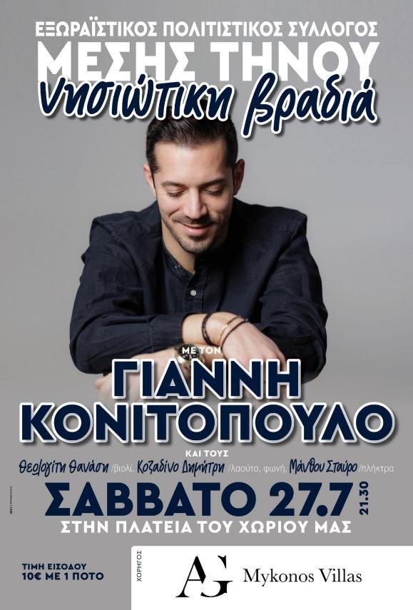 Ο Εξωραϊστικός Πολιτιστικός Σύλλογος Μέσης Τήνου σας καλεί στην Νησιωτική Βραδιά με τον Γιάννη Κονιτόπουλο και τους: