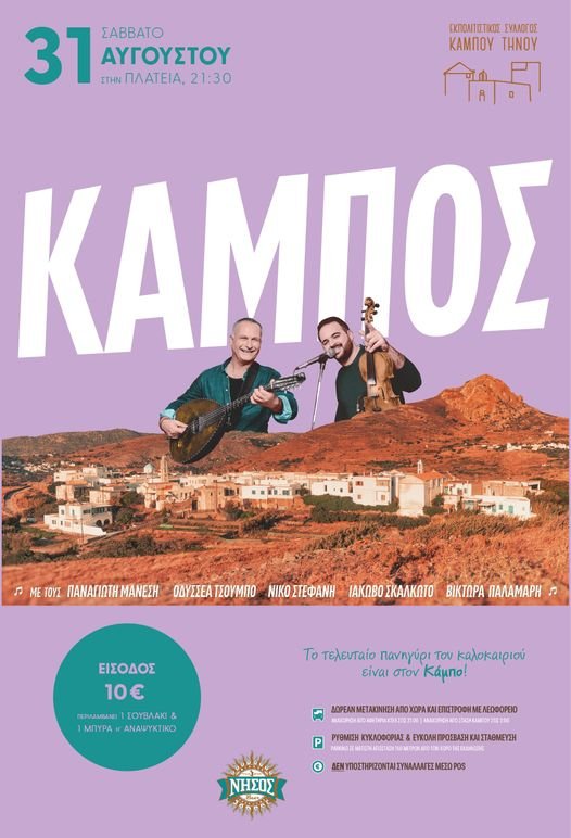 Δίνουμε, όμως, ραντεβού στην πλατεία του Κάμπου, το Σάββατο 31/8 από τις 21:30, για να διασκεδάσουμε όλοι μαζί στο τελευταίο πανηγύρι του Αυγούστου, με την ίδια γιορτινή διάθεση, υπό την μουσική του Παναγιώτη Μάνεση, Οδυσσέα Τσουμπού, Νίκου Στεφανή, Ιάκωβου Σκαλκώτου και Βίκτωρα Παλαμάρη. Φυσικά, από την γιορτινή βραδιά, δεν μπορούν να λείπουν μελένιες εκπλήξεις. Σας περιμένουμε!