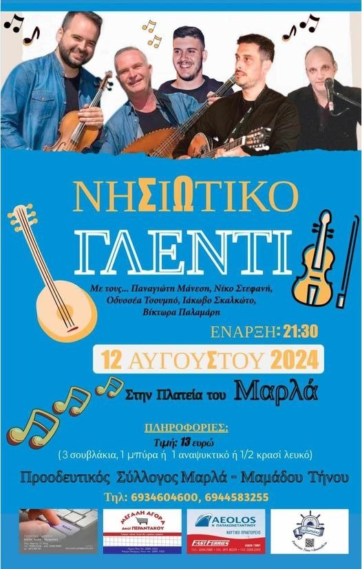 Με χαρά σας προσκαλούμε στο “ΝΗΣΙΩΤΙΚΟ ΓΛΕΝΤΙ” στην Πλατεία του Μαρλά στις 12/8/2024!!!