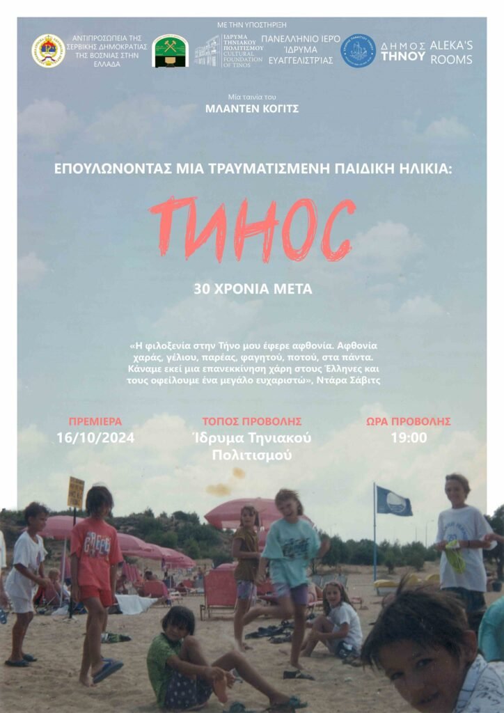 Το ντοκιμαντέρ «Επούλωση μιας τραυματισμένης παιδικής ηλικίας: Τήνος 30 χρόνια μετά» (62′) του σκηνοθέτη Μλάντεν Κόιτς είναι μια συναισθηματική ιστορία φιλίας ανάμεσα στον ελληνικό και τον σερβικό λαό, διαποτισμένη με ενσυναίσθηση, αγάπη και αλληλεγγύη. Στο επίκεντρο αυτής της ιστορίας βρίσκεται η μοίρα των παιδιών από τη Βοσνία-Ερζεγοβίνη, των οποίων η παιδική ηλικία διακόπηκε βίαια με την έναρξη των πολεμικών συγκρούσεων. Τα παιδιά αυτά έχασαν τα σπίτια τους, μέλη της οικογένειάς τους, την ελευθερία τους και την ανεμελιά που μέχρι τότε απολάμβαναν.