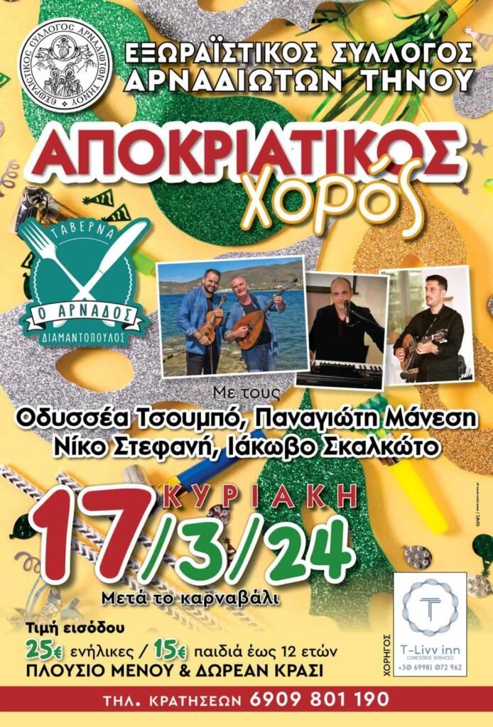 Στις 17 Μαρτίου 2024, σας καλούμε μετά το τέλος του Καρναβαλιού στον Αποκριάτικο Χορό του Συλλόγου Αρνάδου Τήνου.