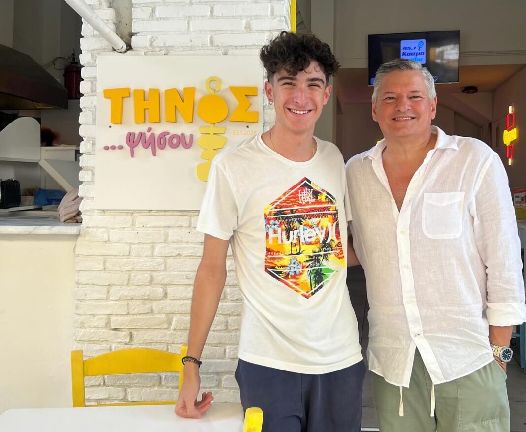 Στη φωτογραφία, ο Mr. Netflix ποζάρει χαμογελαστός με τον Μιχαήλ Εφραίμ Τσουμπό, έναν νεαρό που εργάζεται στο ψητοπωλείο “Τήνος Ψήσου” στο νησί. Η λεζάντα της φωτογραφίας γράφει: