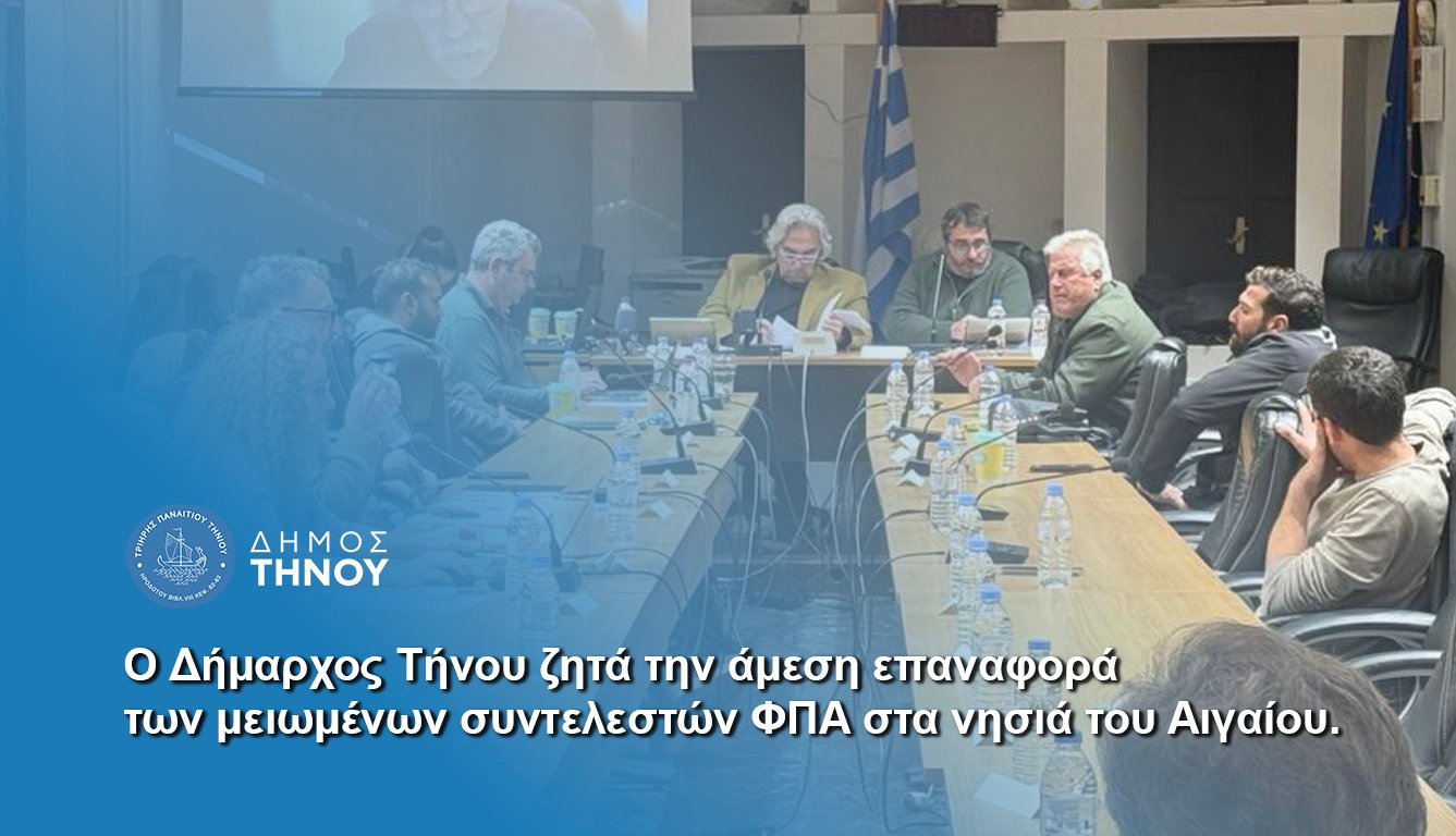 Με αυτό, ζητά την άμεση και πλήρη επαναφορά του καθεστώτος των μειωμένων συντελεστών ΦΠΑ στα νησιά των Κυκλάδων και του Αιγαίου.