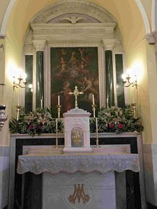 Το κεντρικό Βήμα του αριστερού κλίτους, όπου βρίσκεται το μαρμάρινο αρτοφόριο στο οποίο φυλάσσεται η Θεία Ευχαριστία, είναι αφιερωμένο στον Ευαγγελισμό της Θεοτόκου. Το ξύλινο τέμπλο του Βήματος που πρέπει να ήταν σύγχρονο και όμοιο προς εκείνο του Αγ. Αντωνίου, λόγω φθοράς, μάλλον, που είχε υποστεί αντικαταστάθηκε από μαρμάρινο που φιλοτέχνησε ο γλύπτης Ιωάννης Φιλιππότης (1964). Η εικόνα του Ευαγγελισμού φέρει την επιγραφή Giuseppe Μanzoni da Camerino dipinse in Ancona 1781(;) (=Ο Ιωσήφ Μanzoni από το Camerino ζωγράφισε στην Ancona το 1781 ή 1787). Το κάτω μέρος εικονίζεται ο αρχάγγελος Γαβριήλ με τον κρίνο στο αριστερό χέρι που χαιρετίζει την γονατιστή Παρθένο Μαρία η οποία με την κεφαλή να κλίνει προς το έδαφος δείχνει την υπακοή της δούλης του Κυρίου, ενώ υπερίπταται η περιστερά του Αγ. Πνεύματος. Στο επάνω μέρος του πίνακα εικονίζεται η Ιερά Καρδία του Ιησού σε ωοειδές πλαίσιο, το οποίο σηκώνουν τέσσερις άγγελοι και μέσα σε σύννεφο δόξας. Το μαρμάρινο αρτοφόριο κατασκεύασε το 2009 ο καρδιανιώτης μαρμαρογλύπτης Αργύρης Μαραβέλιας (βλ. φωτογραφία στην αρχή της σελίδας).