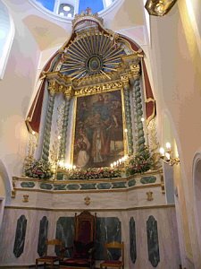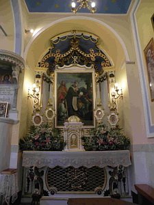 Tο κεντρικό Βήμα του δεξιού κλίτους είναι αφιερωμένο στον Άγ. Αντώνιο της Παδούης, έναν από τους δημοφιλέστερους αγίους της Εκκλησίας στη Δύση, με πολλή συμπάθεια και μεταξύ των χριστιανών της Ανατολής. Το τέμπλο είναι ξύλινο, επίχρυσο κατασκευασμένο στην Τήνο τον 18ο αιώνα. Το αρτοφόριο, ξυλόγλυπτο κατασκευασμένο μάλλον στην Ιταλία, έχει το μορφή αρχαίου ναού και συντηρήθηκε από τον αείμνηστο καλλιτέχνη Γιάννη Φώσκολο. Η εικόνα του Αγίου είναι ιταλική, του 18ου αιώνα και αναφέρεται σε ένα θαύμα του Αγίου της Πάδοβας. Η επιγραφή λέει: ERETICO CONVERTITTO DA VN MVLO CHE TRALASCIATA LA BIADA PROPOSTA OBEDI A S.TO ANTONIO DI PADOVA CHE GLI COMANDAVA LA GANVFLESSIONE AL VENERABILE SAGRAMENTO E VENERO IL GRAN MISTERO CON TRALASIAR IL CIBO NELLE FAME DI TRE GIORNI. Gio(vanni) Batt(ist)a Fabri Pinxit. (= ΑΙΡΕΤΙΚΟΣ ΠΟΥ ΜΕΤΑΣΤΡΑΦΗΚΕ ΑΠΟ ΕΝΑ ΜΟΥΛΑΡΙ, ΤΟ ΟΠΟΙΟ ΑΦΗΣΕ ΤΗΝ ΤΡΟΦΗ ΠΟΥ ΤΟΥ ΕΔΙΝΑΝ ΚΑΙ ΥΠΑΚΟΥΣΕ ΣΤΟΝ ΑΓ. ΑΝΤΩΝΙΟ ΤΗΣ ΠΑΔΟΒΑΣ ΠΟΥ ΤΟ ΔΙΕΤΑΞΕ ΝΑ ΓΟΝΑΤΙΣΕΙ ΕΜΠΡΟΣ ΣΤΟ ΑΓΙΟΤΑΤΟ ΜΥΣΤΗΡΙΟ ΚΑΙ ΠΡΟΣΚΥΝΗΣΕ ΤΟ ΜΕΓΑΛΟ ΜΥΣΤΗΡΙΟ ΑΦΗΝΟΝΤΑΣ ΤΗΝ ΤΡΟΦΗ ΑΝ ΚΑΙ ΔΕΝ ΕΙΧΕ ΤΡΑΦΕΙ ΑΠΟ ΤΡΕΙΣ ΜΕΡΕΣ. Ο Ιωάννης Βαπτιστής Fabri ζωγράφισε).
