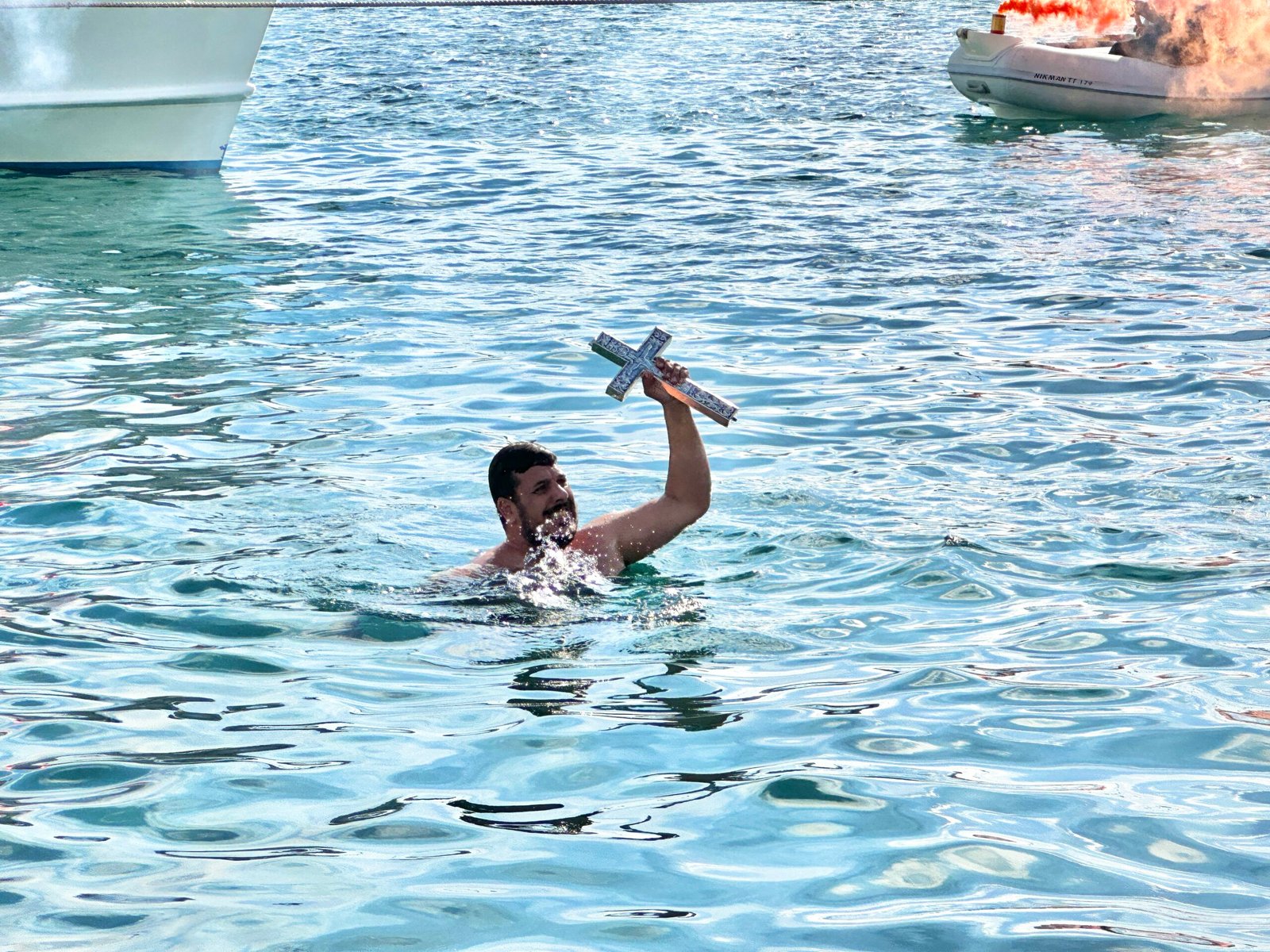 Αρκετοί ήταν οι «τολμηροί» που βούτηξαν στα κρύα νερά στο λιμάνι της Τήνου για τον Σταυρό, τον οποίο ωστόσο έπιασε ο Ιωάννης Κρεμόνας για 6η φορά.