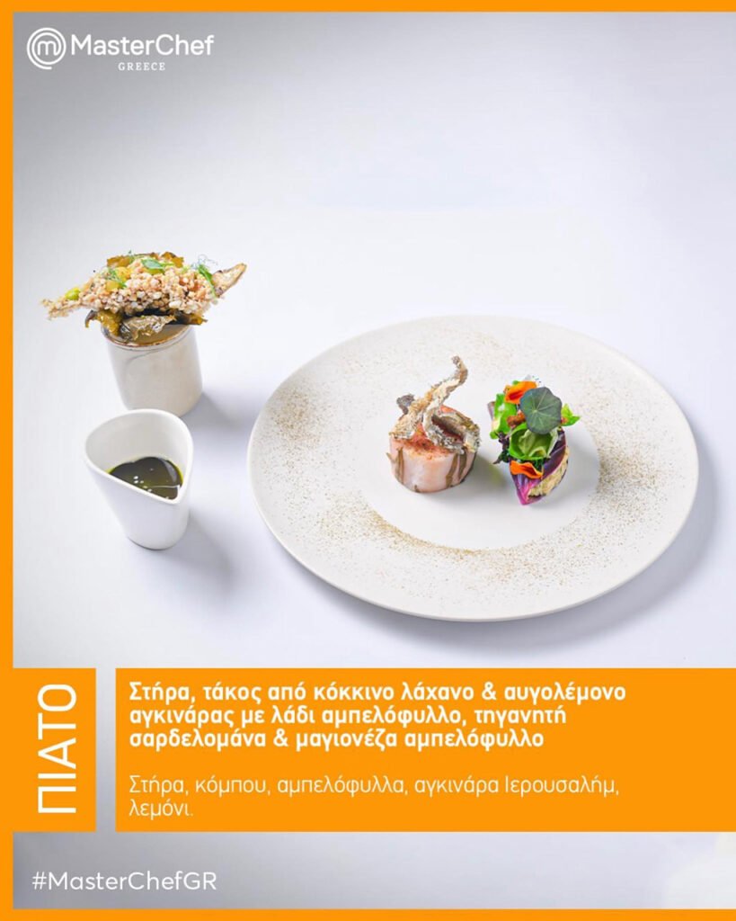 Ο ταλαντούχος σεφ μαγείρεψε στήρα, τάκος από κόκκινο λάχανο και αυγολέμονο αγκινάρας και δυσκόλεψε αρκετά τους παίκτες του διαγωνισμού που κλήθηκαν να αντιγράψουν το πιάτο το οποίο θύμιζε έργο τέχνης!