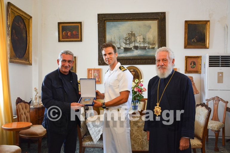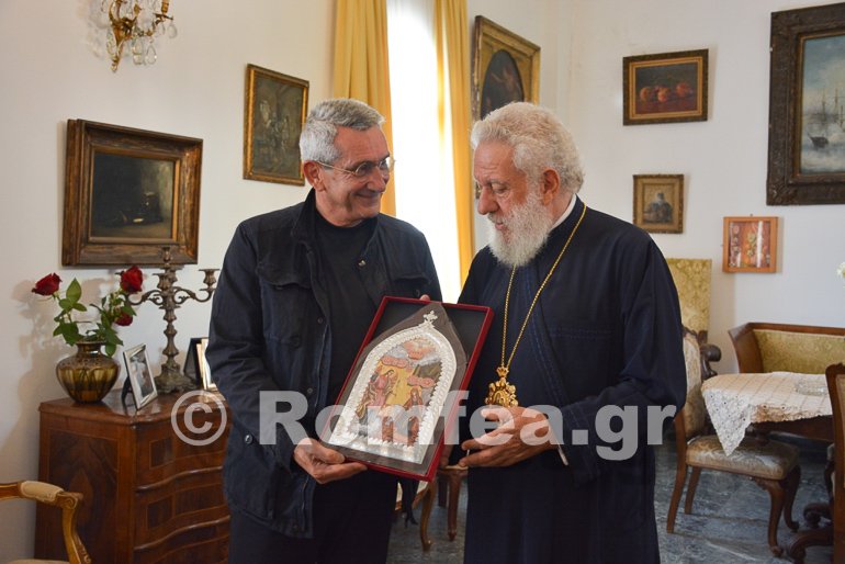 Ο Σεβασμιώτατος τον ευχαρίστησε για την εξ’ ολοκλήρου αποκατάσταση του Ιερού Ναού Αγίας Αικατερίνης Κάμπου και για την συντήρηση του τέμπλου του Ιερού Ναού Παναγίας Καταπολιανής Υστερνίων Τήνου.
