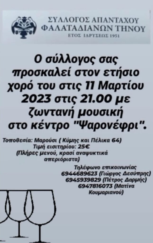 Σκοπός μας είναι να βρεθούμε όλοι μαζί, να ανταλλάξουμε τα νέα μας και να διασκεδάσουμε στον ετήσιο χορό, στις 11 Μαρτίου 2023 στις 21.00 με ζωντανή μουσική στο κέντρο “Ψαρονέφρι” στο Μαρούσι (Κύμης και Πέλικα 64) με τιμή εισιτηρίου 25 ευρώ (με πλήρες μενού, απεριόριστο κρασί και αναψυκτικά).