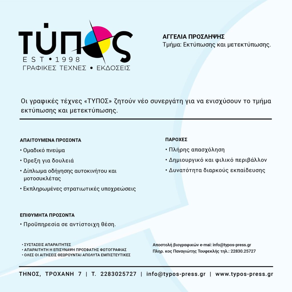 Οι γραφικές τέχνες ΤΥΠΟΣ ζητούν νέο συνεργάτη για να ενισχύσουν το τμήμα εκτύπωσης και μετεκτύπωσης.