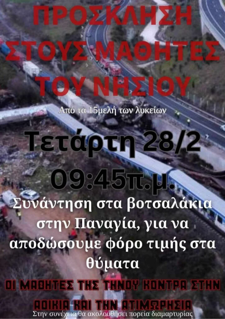 Τα 15μελή των Λυκείων της Τήνου προσκαλούν τους μαθητές και τους κατοίκους του νησιού, την Τετάρτη 28/2 στις 9.45 στο προάυλιο (βολάκια) του Ιερού Ναού Ευαγγελιστρίας Τήνου.