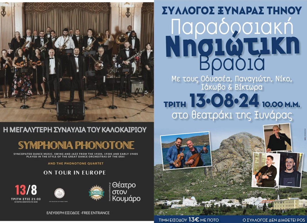 Η Τήνος σήμερα, 13 Αυγούστου, προσφέρει δύο ξεχωριστές εκδηλώσεις που θα γεμίσουν τη βραδιά σας με μαγεία και διασκέδαση.