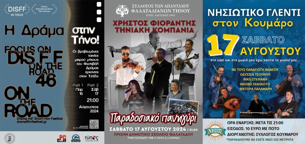 Η Τήνος απόψε, 17 Αυγούστου, είναι γεμάτη από εκδηλώσεις που προσφέρουν κάτι για όλους, από σινεφίλ μέχρι λάτρεις της παραδοσιακής μουσικής. Ετοιμαστείτε για μια βραδιά γεμάτη ποικιλία και κέφι!