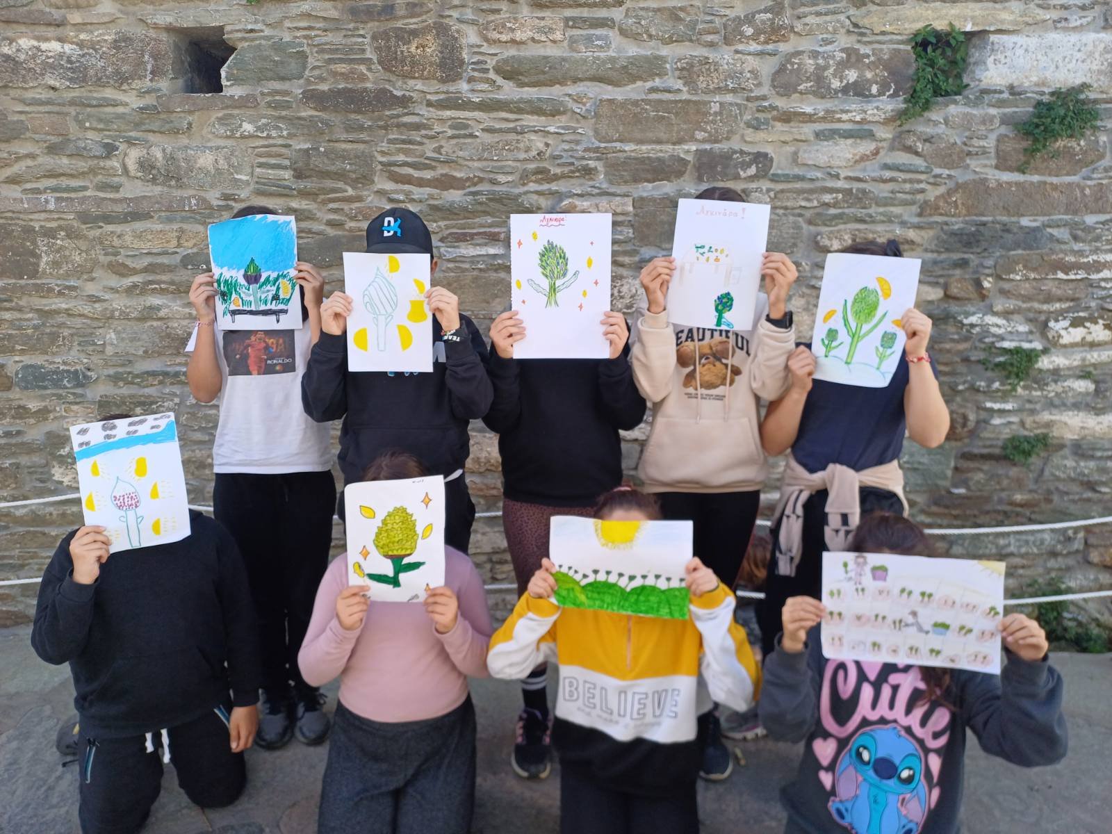 Έπειτα τα παιδιά επιστράτευσαν τη δημιουργικότητα και την καλλιτεχνική τους έφεση και προσπάθησαν να δημιουργήσουν αφίσες με θέμα την αγκινάρα αποτυπώνοντας την σε χαρτί με μπογιές και χρώματα.