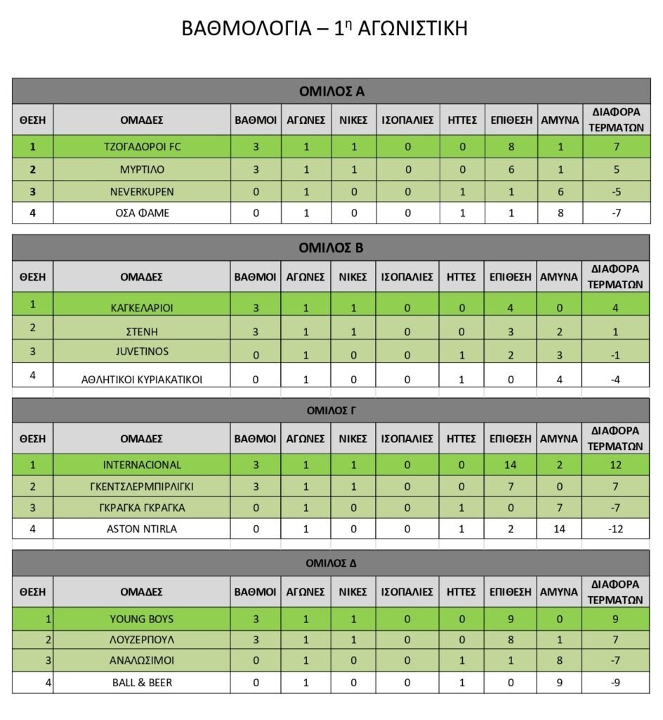 Παρακάτω θα δείτε τη βαθμολογία της 1ης αγωνιστικής και τις ομάδες: