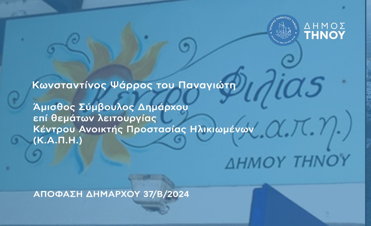 Ορισμός άμισθου Συμβούλου Δημάρχου Δήμου Τήνου επί θεμάτων λειτουργίας Κέντρου Ανοικτής Προστασίας Ηλικιωμένων (Κ.Α.Π.Η.)