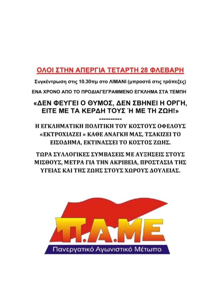Συγκέντρωση στις 10.30πμ στο ΛΙΜΑΝΙ (μπροστά στις τράπεζες) ΕΝΑ ΧΡΟΝΟ ΑΠΟ ΤΟ ΠΡΟΔΙΑΓΕΓΡΑΜΜΕΝΟ ΕΓΚΛΗΜΑ ΣΤΑ ΤΕΜΠΗ «ΔΕΝ ΦΕΥΓΕΙ Ο ΘΥΜΟΣ, ΔΕΝ ΣΒΗΝΕΙ Η ΟΡΓΗ, ΕΙΤΕ ΜΕ ΤΑ ΚΕΡΔΗ ΤΟΥΣ Ή ΜΕ ΤΗ ΖΩΗ!»