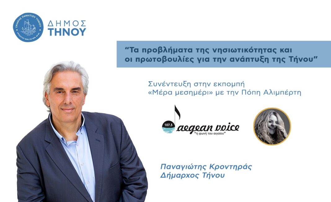 Σε μια εφ’ όλης της ύλης συνέντευξη στον Aegean Voice 107.5 και την εκπομπή «Μέρα μεσημέρι» με την Πόπη Αλιμπέρτη, ο Δήμαρχος Τήνου, Παναγιώτης Κροντηράς, αναφέρθηκε στα σημαντικά ζητήματα που αντιμετωπίζουν οι νησιωτικοί δήμοι, αλλά και στις πρωτοβουλίες που αναλαμβάνει η δημοτική αρχή για την ενίσχυση των υποδομών του νησιού.